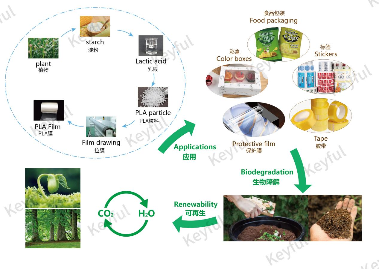 PLA膜在工業(yè)堆肥的條件下,在六個(gè)月內(nèi)最終會(huì)降解成為水和二氧化碳,對(duì)大自然完全無(wú)害,